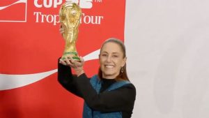 Ello generó sorpresa, cuando en el salón Tesorería de Palacio Nacional, Claudia Sheiunbam, alzó el trofeo, al igual que hizo el ex jugador brasileño José Roberto Gama de Oliveira, Bebeto -ambos sin guantes-, quien además lo besó y arrulló como solía celebrar cuando anotaba y como hizo cuando ganó junto a la Verdeamarela su cuarta estrella mundialista en Estados Unidos 1994.