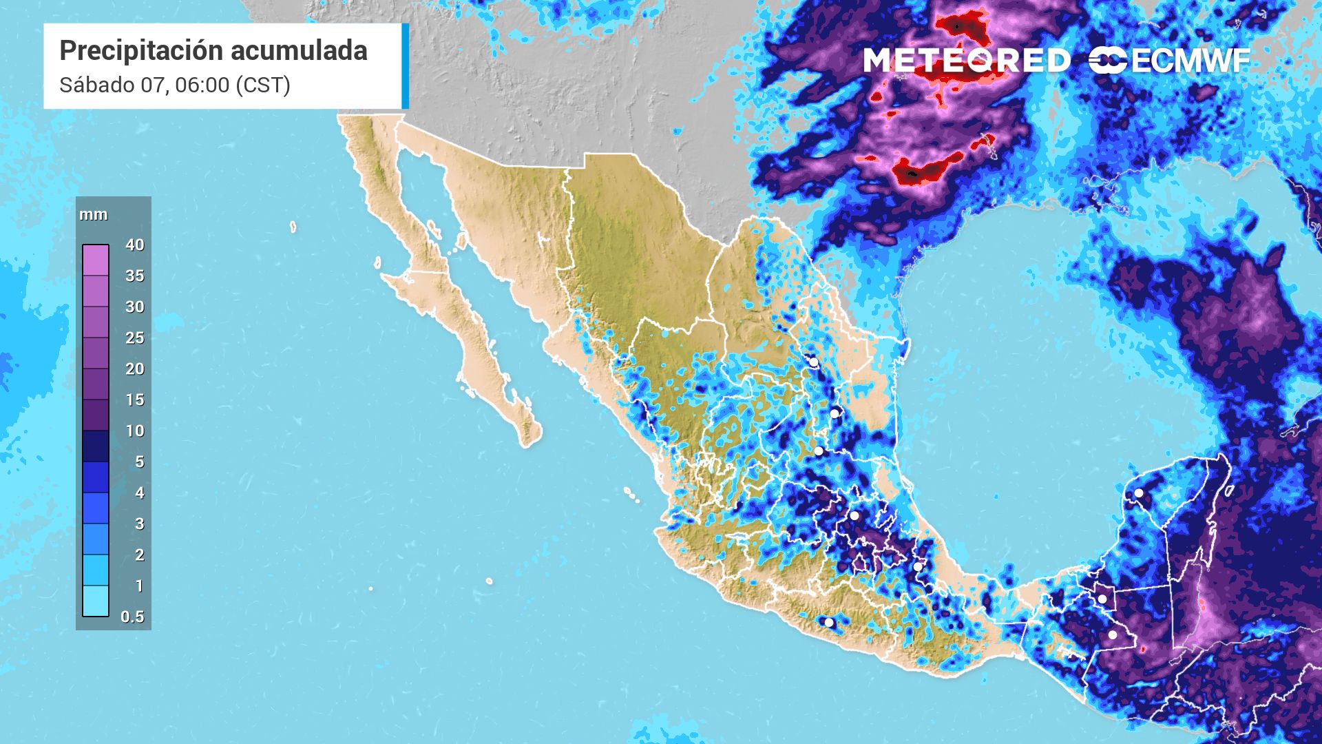 Pronóstico de lluvia acumulada para este jueves en México.