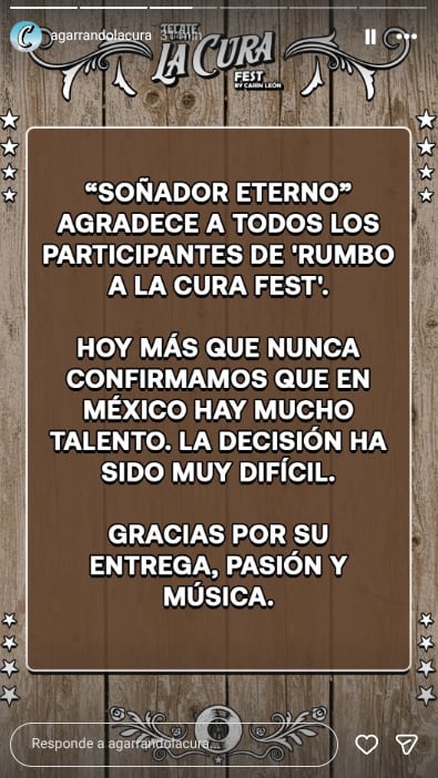 “Soñador Eterno agradece a todos los participantes de ‘Rumbo a La Cura Fest’. Hoy más que nunca confirmamos que en México hay mucho talento. La decisión ha sido muy difícil. Gracias por su entrega, pasión y música”, señala el texto difundido en redes sociales.