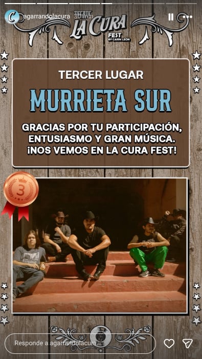 A través de redes sociales, la cuenta oficial del festival dio a conocer que la banda Murrieta Sur obtuvo el tercer lugar dentro de la convocatoria “Rumbo a La Cura Fest”, un proceso en el que diversas agrupaciones emergentes participaron para ganarse un espacio en el cartel.