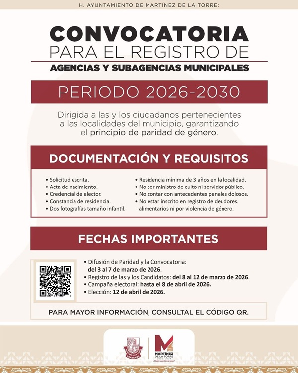 El H. Ayuntamiento de Martínez de la Torre informa a la ciudadanía de las localidades del municipio sobre la apertura de la Convocatoria para el registro de Agencias y Subagencias Municipales correspondiente al periodo 2026-2030, garantizando el principio de paridad de género y promoviendo la participación ciudadana en los procesos de representación comunitaria.