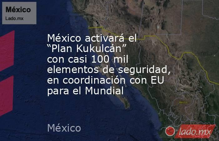 La Secretaría de la Defensa Nacional (Sedena), en coordinación con la Secretaría de Seguridad y Protección Ciudadana desplegarán el “Plan Kukulcán” en la Ciudad de México, Guadalajara y Monterrey con casi 100 mil efectivos de seguridad de cara a la Copa Mundial, quedará inicio el próximo 11 de junio. En la conferencia de prensa matutina, realizada desde Jalisco, una de las sedes del evento deportivo, el titular de seguridad del país, Omar Garcia Harfuch dijo que el objetivo es enfrentar posibles amenazas, que atente contra la seguridad nacional.