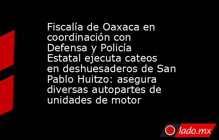- Como parte de las labores de investigación ministerial para el combate de delitos de alto impacto, la Fiscalía General del Estado de Oaxaca (FGEO) ejecutó dos órdenes de cateo en distintos domicilios ubicados en el municipio de San Pablo Huitzo, en la región de los Valles […]The post Fiscalía de Oaxaca en coordinación con Defensa y Policía Estatal ejecuta cateos en deshuesaderos de San Pablo Huitzo: asegura diversas autopartes de unidades de motor appeared first on Página 3.