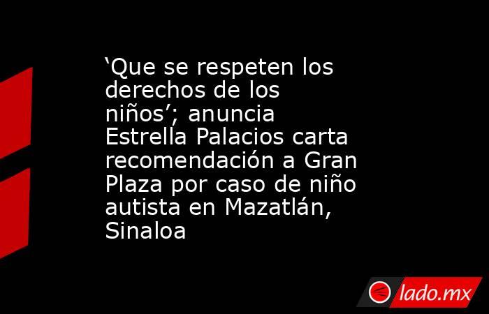 Mazatlán, Sinaloa.- Luego de darse a conocer el caso de una familia que denunció un acto discriminatorio al interior de Gran Plaza Mazatlán, donde los guardias de seguridad no permitieron el libre acceso de un niño con el Trastorno del Espectro Autista (TEA) por andar sin zapatos, la alcaldesa Estrella Palacios Domínguez, anunció que como gobierno estarán enviando una carta recomendación a la administración de esta plaza comercial.
