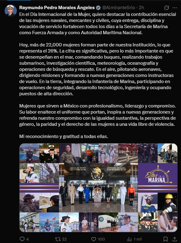 “Su labor enaltece el uniforme que portan e inspira a nuevas generaciones”, escribió el almirante secretario, quien cerró con un reconocimiento personal a todas las mujeres que, desde distintos frentes, sirven a México con profesionalismo, liderazgo y compromiso.