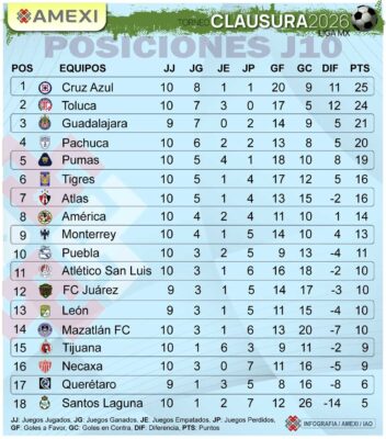 La tabla general se mantiene sin movimientos en los tres primeros lugares, al concluir los encuentros de la jornada 10 del Torneo Clausura 2026, donde Pumas de la UNAM, Cruz Azul, América, Chivas, Tigres de la UANL y Toluca ganaron sus respectivos encuentros.