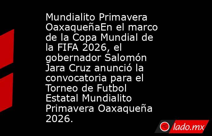 Mundialito Primavera OaxaqueñaEn el marco de la Copa Mundial de la FIFA 2026, el gobernador Salomón Jara Cruz anunció la convocatoria para el Torneo de Futbol Estatal Mundialito Primavera Oaxaqueña 2026. NVI Noticias