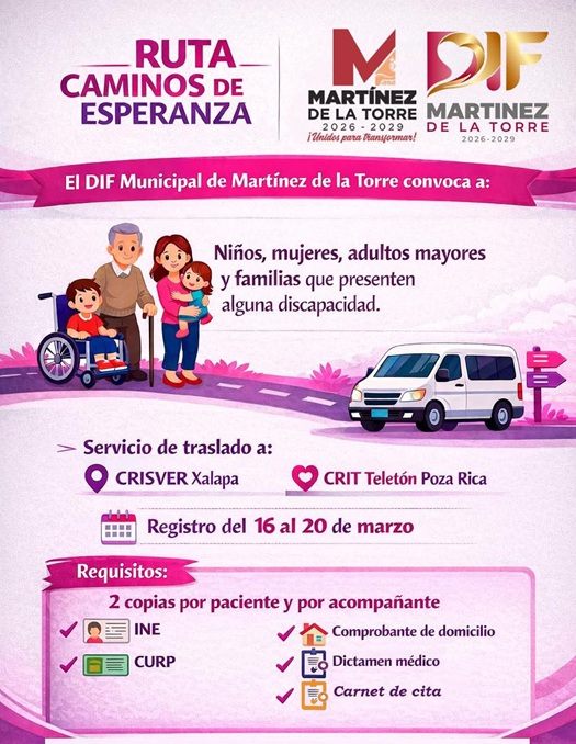 El Sistema para el Desarrollo Integral de la Familia (DIF) Municipal de Martínez de la Torre abrió la convocatoria para que personas con discapacidad se registren y puedan formar parte de la Ruta “Caminos de Esperanza”, un servicio de traslado que facilita la asistencia a consultas y terapias en el CRISVER de Xalapa y en el CRIT de Poza Rica.