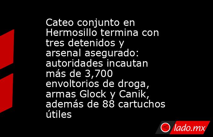 Hermosillo, Sonora; 12 de marzo de 2026.— Un operativo conjunto encabezado por personal del Ejército Mexicano derivó en la detención de tres personas y el aseguramiento de droga, armamento y un vehículo en un domicilio del fraccionamiento Buena Vista, en la ciudad de Hermosillo.