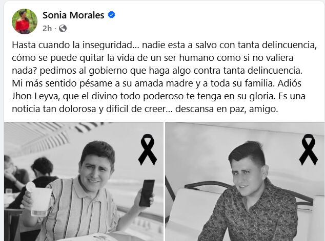 Sonia Morales, otro referente del folclore, se sumó al reclamo por mayor seguridad. “Hasta cuándo la inseguridad… nadie está a salvo con tanta delincuencia, cómo se puede quitar la vida de un ser humano como si no valiera nada. Pedimos al gobierno que haga algo contra tanta delincuencia. Mi más sentido pésame a su amada madre y a toda su familia. Adiós Jhon Leyva, que el divino todo poderoso te tenga en su gloria. Es una noticia tan dolorosa y difícil de creer… descansa en paz, amigo”, escribió en sus redes sociales.