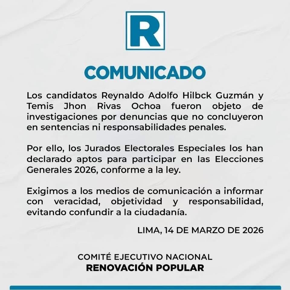 “Por ello, los Jurados Electorales Especiales lo ha declarado apto para participar en las Elecciones Generales 2026, conforme a la ley”, comunicó la agrupación.