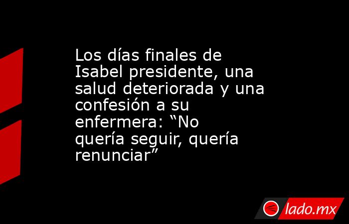 Norma Bailo estuvo a cargo de su cuidado durante esos días. “Durante esa internación, un día a la noche estaba con ella, le habían traído un vestido para salir en televisión y me dijo que no quería seguir más, que quería renunciar”, relata. “Llegó un momento en que le dije: ‘Señora, haga lo que su corazón le dice. No se exija más’. Y entonces me respondió: ‘Tenés razón’”. Sin embargo, no pudo continuar a su lado. Según cuenta, su entorno la apartó al advertir que estaba alentando a Isabel a tomar la decisión que deseaba. “Me llevaron a otro lugar del sanatorio y, al rato, la vi salir por televisión reafirmando su decisión de seguir en la presidencia”, agrega.