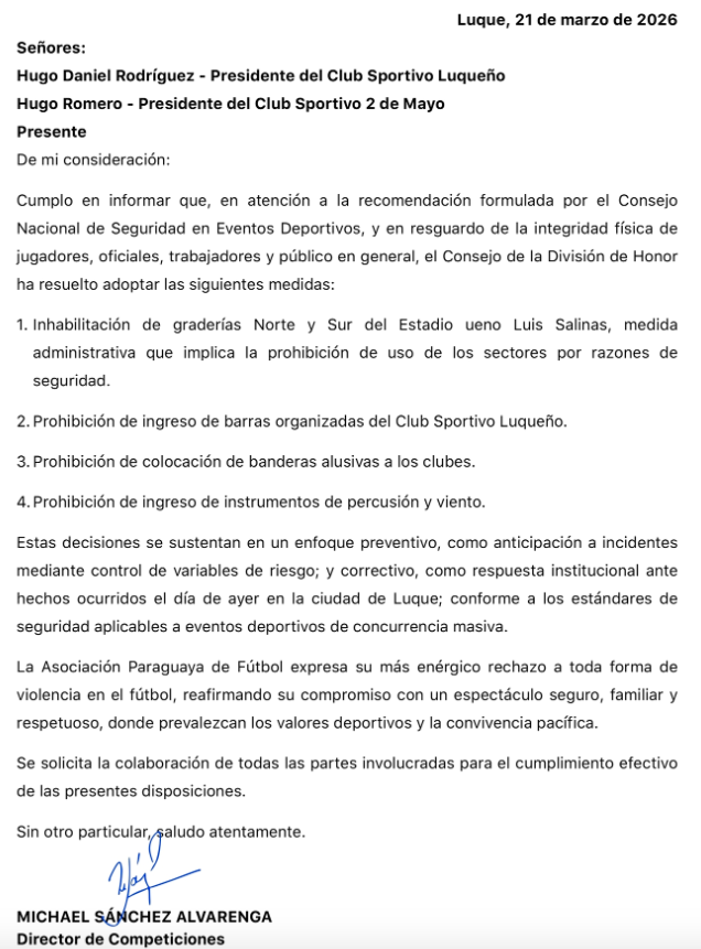 "En atención a la recomendación formulada por el Consejo Nacional de Seguridad en Eventos Deportivos, y en resguardo de la integridad física de jugadores, oficiales, trabajadores y público en general, el Consejo de la División de Honor ha resuelto la inhabilitación de graderías Norte y Sur del estadio ueno Luis Salinas, medida administrativa que implica la prohición de uso de los sectores por razones de seguridad", reza la primera parte.