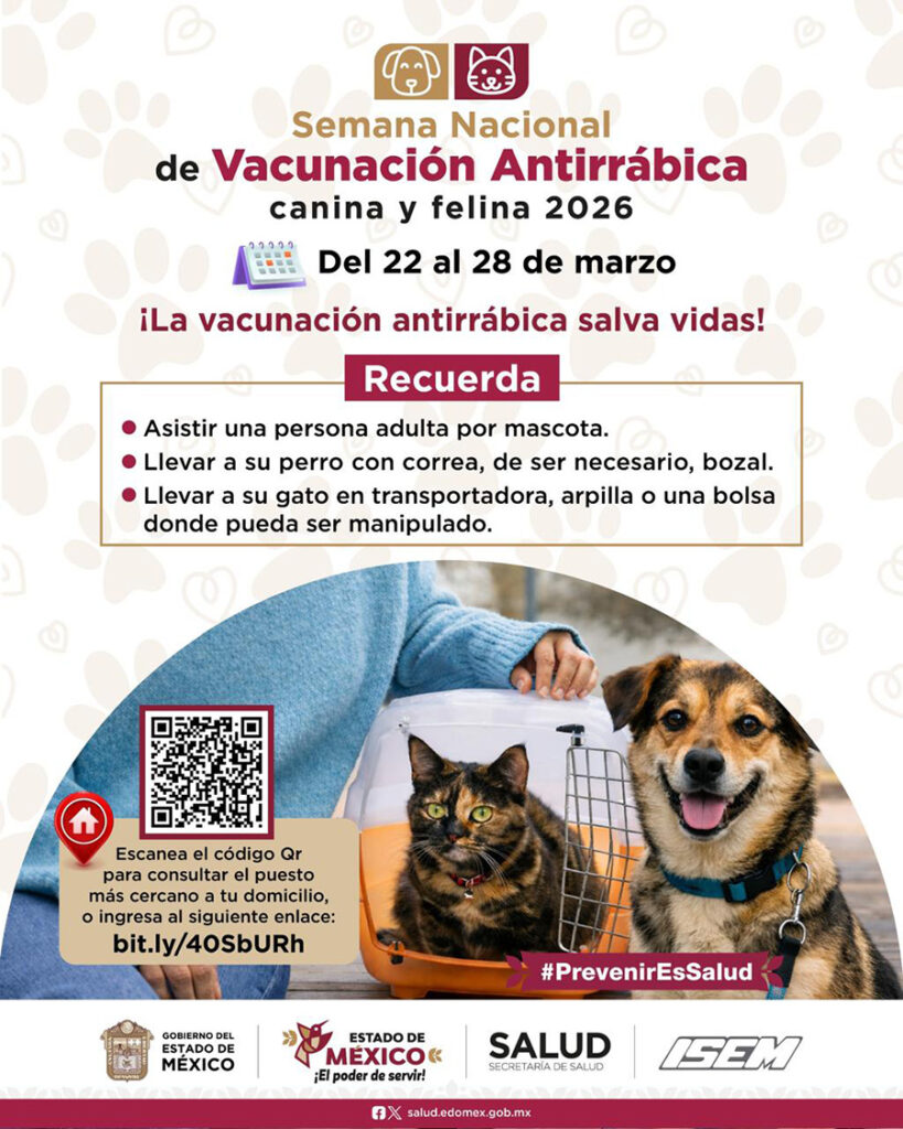 Del 22 al 28 de marzo participa en la Semana Nacional de Vacunación Antirrábica Canina y Felina 2026.