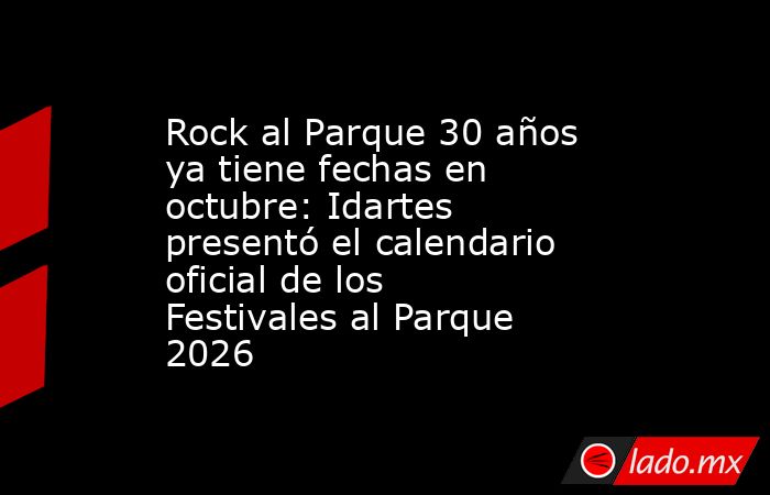 El Instituto Distrital de las Artes (Idartes) confirmó la programación que abrirá el 9 y 10 de mayo con Joropo al Parque en la Plaza de Bolívar y culminará el 28 y 29 de noviembre con Salsa al Parque en el Parque Simón Bolívar. En el centro de la agenda, los días 10, 11 y 12 de octubre, Bogotá celebrará 30 años de Rock al Parque, consolidando su lugar como patrimonio cultural de la ciudad y referente internacional.