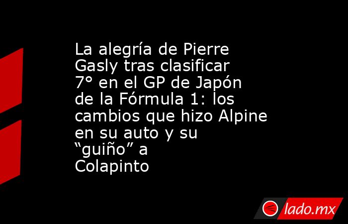 Pierre Gasly tuvo una destacada labor en la clasificación del Gran Premio de Japón de la Fórmula 1 y largará desde la séptima colocación, misma posición desde la que empezó en el GP de China dos semanas atrás. El piloto francés de 30 años se mostró muy contento por esta producción y habló de la carrera de este domingo, que empezará a las 2 de la mañana (hora argentina), con una referencia a lo que pueden dar él y su compañero Franco Colapinto, quien fue eliminado en la Q2 e iniciará en el 15° lugar.