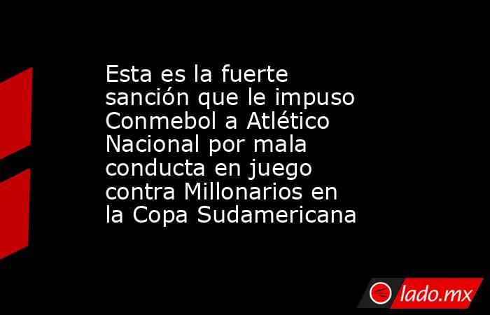 La Comisión Disciplinaria de la Conmebol sancionó al club Atlético Nacional con una multa de USD 100.000 por infringir el artículo 15.2 del Código Disciplinario durante competiciones organizadas por la entidad, como ocurrió en el juego ante Millonarios en la fase 1 de la Copa Sudamericana, según resolución publicada en el sitio oficial de la confederación.