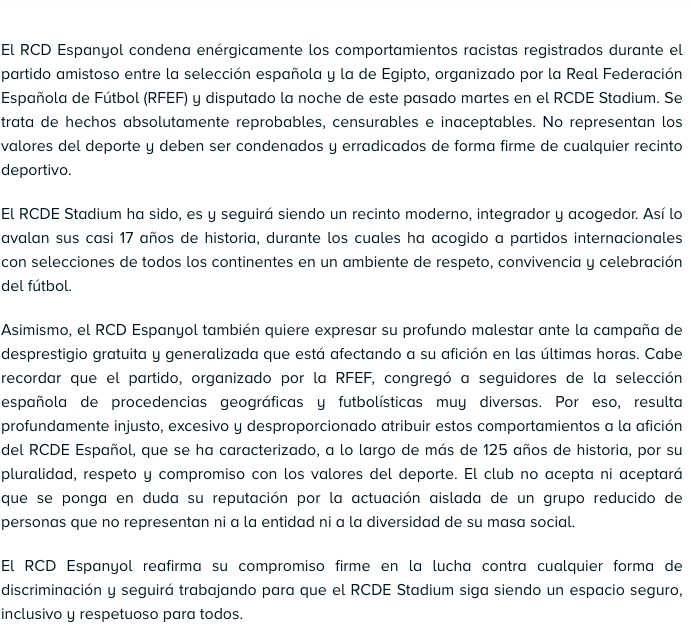 “El RCD Espanyol condena enérgicamente el comportamiento racista registrado durante el partido amistoso entre la selección española y la selección egipcia, organizado por la Real Federación Española de Futbol (RFEF) y disputado la pasada noche del martes en el RCDE Stadium”, arrancó el comunicado del club ‘perico’.