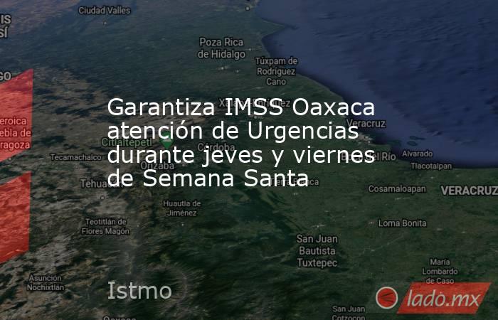 El Instituto Mexicano del Seguro Social (IMSS) en Oaxaca informa a su población derechohabiente que, con motivo de los días jueves y viernes de Semana Mayor, las áreas de Urgencias en hospitales y Unidades de Medicina Familiar (UMF) de la entidad mantendrán servicio permanente, a fin de garantizar la atención médica oportuna a quienes lo requieran.