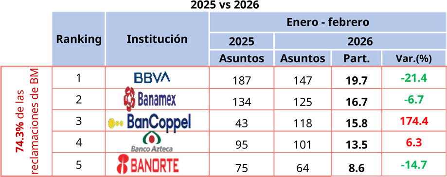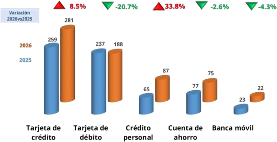 En cuanto a los productos financieros de la BM, las reclamaciones estuvieron vinculadas a tarjeta de crédito, tarjeta de débito y crédito personal, que acumularon el 74.4% de las quejas recibidas.