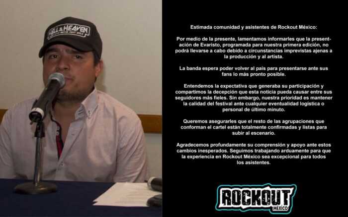 A un mes de la fecha en que está anunciada su realización, el festival de punk y ska Rockout se quedó sin uno de sus headliners, Evaristo, quien fue el primer artista anunciado para el evento musical y con el cual comenzó a promoverse desde finales de enero de este año.