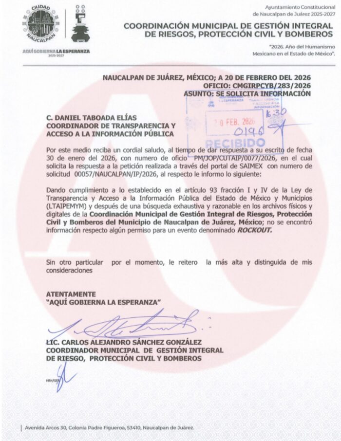 “El Gobierno Municipal de Naucalpan informa que, respecto al evento denominado Rockout, no se cuenta con registro oficial alguno sobre solicitud, trámite o autorización para su realización ante las áreas correspondientes. Tanto la Dirección Municipal de Protección Civil como la Secretaría del Ayuntamiento confirman que, hasta el momento, no existe ingreso de documentación ni gestión formal relacionada con dicho evento”, expresó el área de comunicación del gobierno local el 27 de febrero, mientras el festival ya vendía boletos anunciando engañosamente que contaba con el apoyo de Naucalpan.