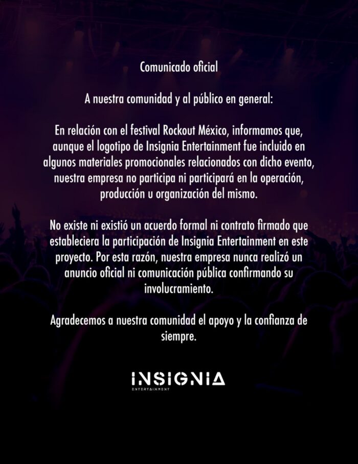 Por otro lado, en su página web, Rockout señala que cuenta con el apoyo de la organizadora de eventos Insignia Entertainment, a pesar de que esta compañía se deslindó del evento desde el 11 de marzo pasado a través de un boletín oficial en sus redes sociales.