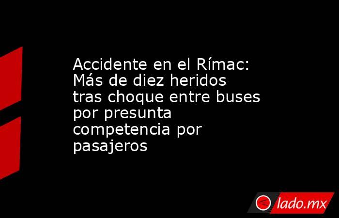 Al menos diez personas resultaron heridas en un accidente de tránsito registrado en la cuadra nueve del Jirón Trujillo, en el distrito del Rímac, luego del choque de dos unidades de transporte público. Según información de Exitosa, el siniestro involucró a un vehículo de la empresa La Bala con placa Z6P-803, que habría estado compitiendo con otra unidad para captar pasajeros.