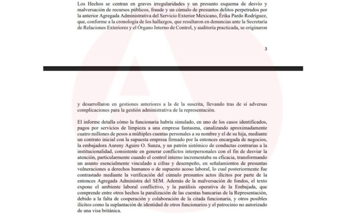 En su documento, González-Blanco señala como principal operadora del esquema de desvío de recursos a Érika Pardo Rodríguez, ex Agregada Administrativa, quien habría operado un “coto de poder” en complicidad con los embajadores David Nájera, Aureny Aguirre y Aníbal Gómez Toledo.