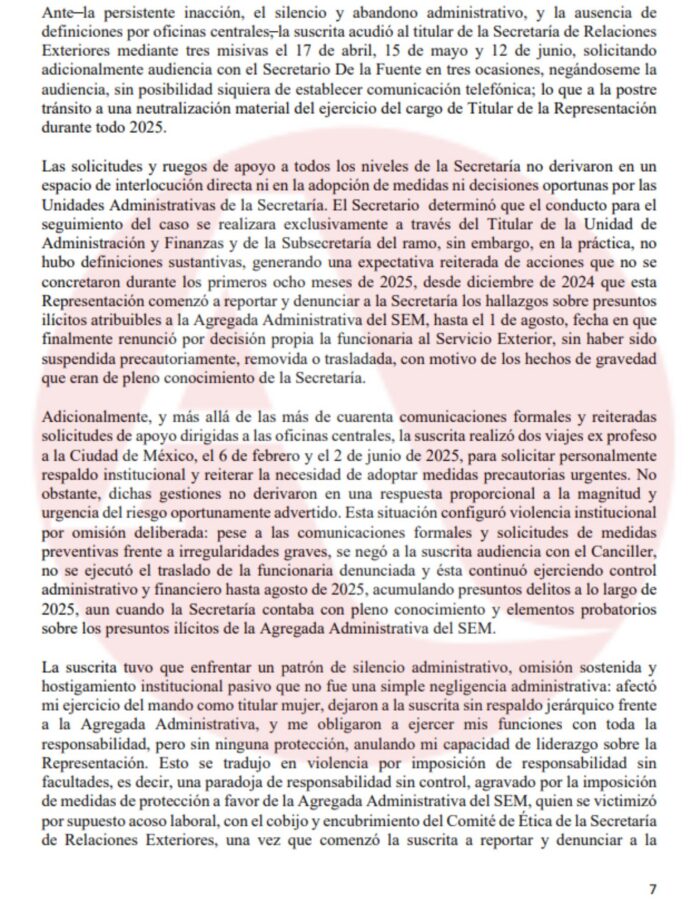 En su escrito, también detalla que, a pesar de emitir más de cuarenta comunicaciones oficiales y realizar dos viajes a la Ciudad de México para advertir sobre los delitos y solicitar el traslado de Pardo, el entonces canciller Juan Ramón de la Fuente le negó audiencia en tres ocasiones y la dependencia no implementó medidas precautorias para separar a la funcionaria de su cargo