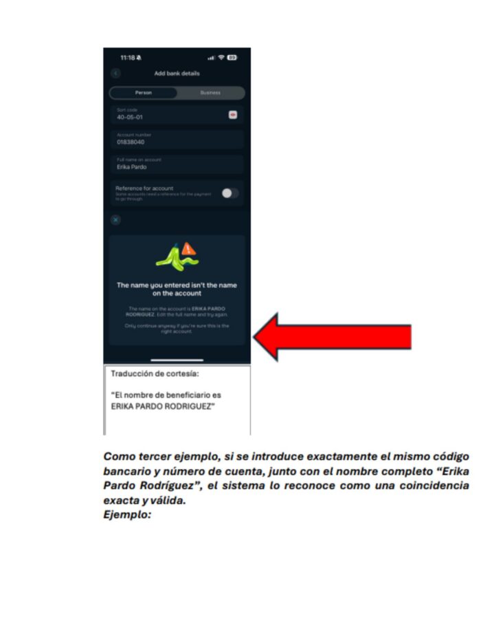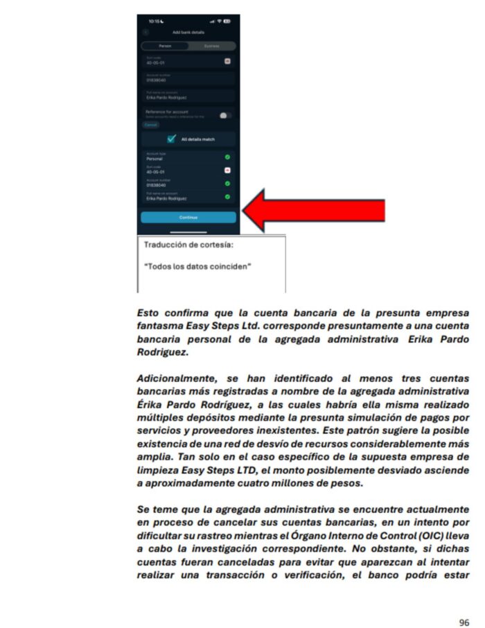 El informe detalla que al simular una transferencia a los datos bancarios que aparecían impresos en las facturas de cobro y colocar como nombre de beneficiario “Easy Steps LTD.” o sus variaciones, el sistema bancario arrojaba una alerta de seguridad indicando que el nombre de beneficiario no coincidía. Sin embargo, al introducir el código y número de cuenta, pero ingresando como nombre de beneficiario el de Érika Pardo Rodríguez, el sistema del banco validaba la información.