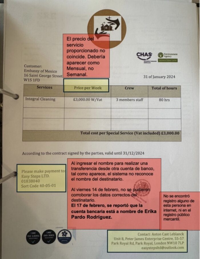 De acuerdo con el informe entregado por Josefa González-Blanco a la Cancillería, en la Embajada de Londres se detectó un presunto esquema de simulación de contratos para el desvío de recursos públicos mediante una empresa “fantasma” de limpieza denominada “Easy Steps Cleaning Service LTD”.