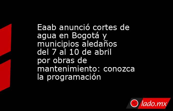 La Empresa de Acueducto y Alcantarillado de Bogotá (Eaab) anunció una jornada de cortes de agua que iniciará el martes 7 de abril y se extenderá hasta el viernes 10 de abril de 2026, con el fin de ejecutar obras de reparación y mantenimiento en las redes de distribución de distintos sectores de la ciudad. Los usuarios pueden consultar el cronograma y áreas de afectación: Consultar aquí.