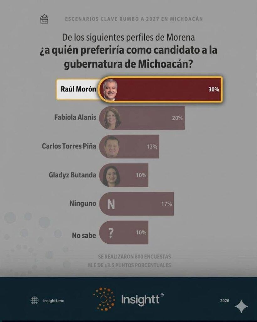 La más reciente encuesta de Insightt, señala que conforme avanzan los meses y se acerca el periodo de definiciones al interior de Morena, el senador Raúl Morón Orozco se consolida como el preferido por el pueblo para ser el candidato por el partido guinda a la gubernatura de Michoacán en el 2027, que lo coloca con el 30% de las preferencias.