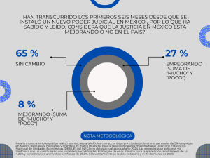 Los datos son contundentes: 65 % de los tomadores de decisión no percibe cambio alguno en la impartición de justicia desde la reforma, 27 % considera que la situación ha empeorado y apenas 8 % reporta mejoras. Esta lectura negativa no es nueva: incluso antes de la reforma, 53 % de las empresas involucradas en litigios valoraba negativamente su experiencia con el sistema de justicia mexicano.