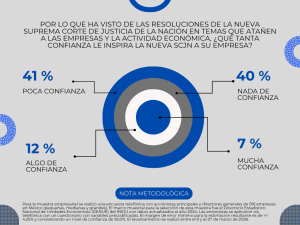 La desconfianza se extiende también hacia la Suprema Corte de Justicia de la Nación (SCJN). Según el monitoreo, 81 % de los tomadores de decisión declara tener «poca» o «nada» de confianza en la SCJN, resultado que Sergio Díaz, socio director de VESTIGA, atribuye directamente al tipo de resoluciones emitidas hasta ahora.