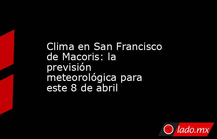 Para este miércoles, se estima que en San Francisco de Macoris habrá un 90% de posibilidad de lluvia, así como una temperatura máxima de 28 centígrados y una mínima de 20°. La nubosidad será del 66% y por la noche habrá una probabilidad del 25% de lluvias.