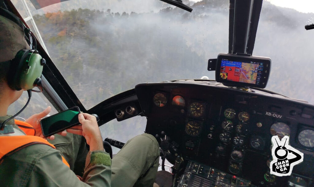 Como parte del reforzamiento de las acciones, se incorporó un helicóptero del Gobierno del Estado equipado con helibalde, el cual realiza descargas de agua en las zonas de difícil acceso, con el objetivo de contener el avance del fuego.