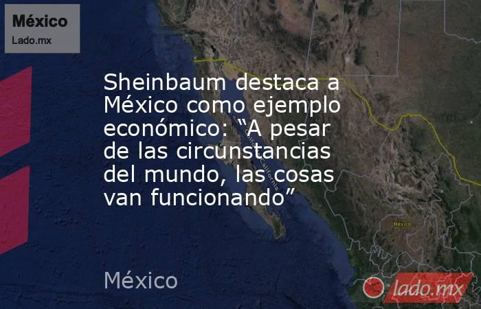 Claudia Sheinbaum Pardo resaltó que “a pesar de las circunstancias difíciles que vive el mundo, las cosas van funcionando; México es un ejemplo”, donde el conflicto de Medio Oriente ha golpeado al precio del crudo en el mercado, hecho que ha llevado a aplicar IEPS a la gasolina para no aumentar los costos, esto al participar en la inauguración del Polo de Desarrollo Económico para el Bienestar en Huamantla, Tlaxcala.
