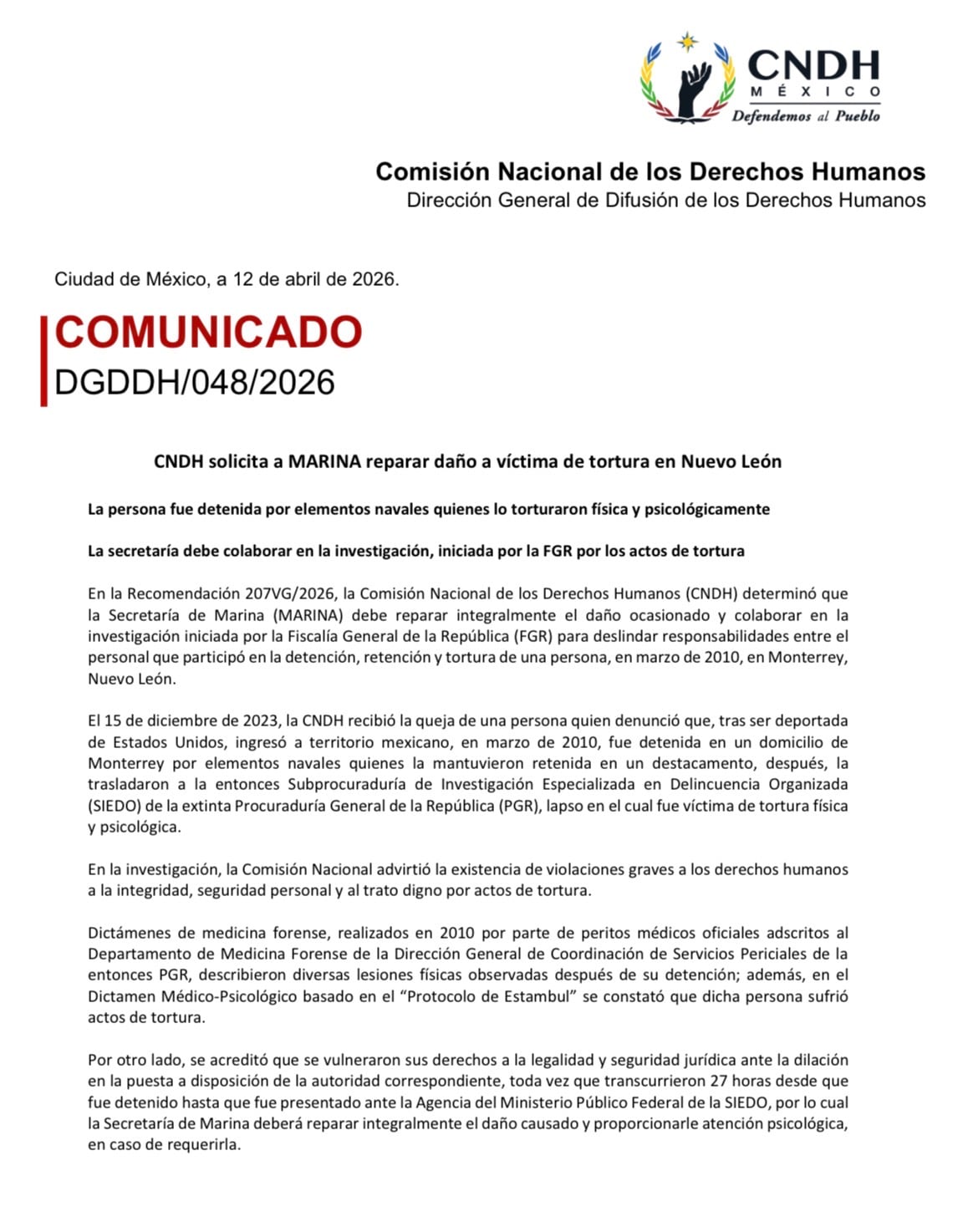 La Comisión Nacional de los Derechos Humanos (CNDH) emitió la Recomendación 207VG/2026 en la que determina que la Secretaría de Marina (SEMAR) debe reparar integralmente el daño ocasionado a una persona que fue detenida, retenida y torturada por elementos navales en Monterrey, Nuevo León, en marzo de 2010.