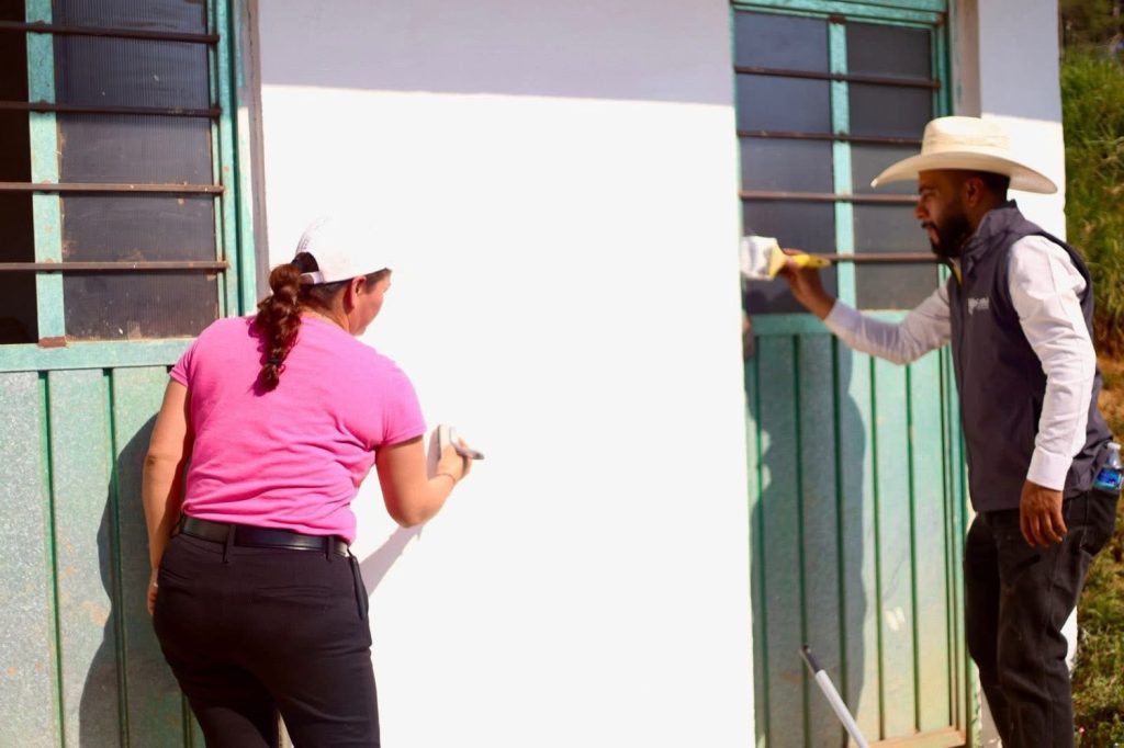 Durante la jornada, se realizaron trabajos de limpieza y pintura en la casa de salud, material proporcionado por el Ayuntamiento, así como labores de jardinería y apoyo en la construcción del piso para el tianguis.