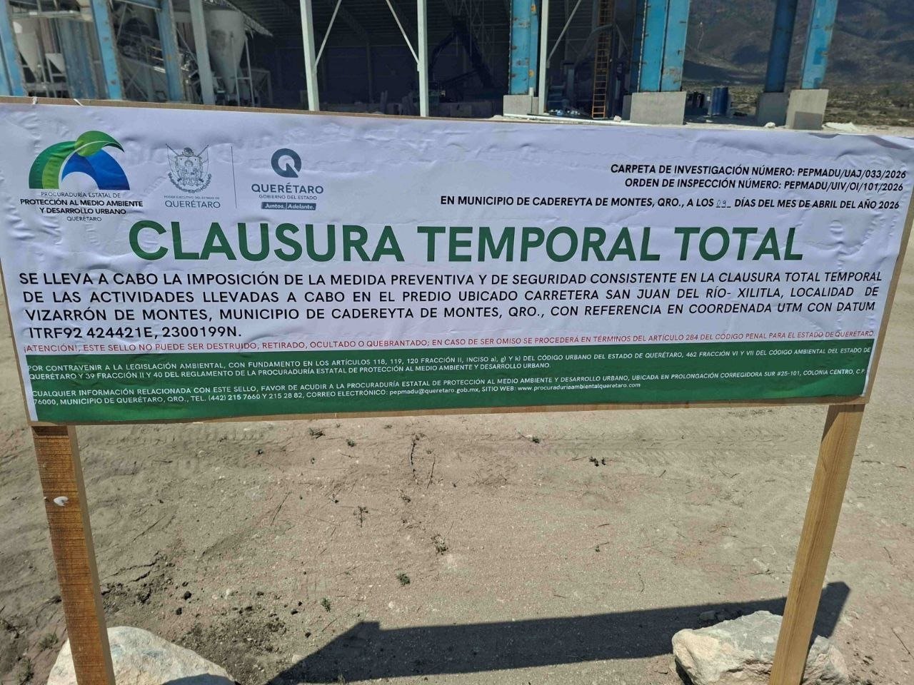 La Procuraduría Estatal de Protección al Medio Ambiente (PEPMADU) clausuró una planta de trituración y molienda de material pétreo ubicada en la comunidad de Vizarrón de Montes, en el municipio de Cadereyta, tras atender denuncias ciudadanas relacionadas con la generación excesiva de polvo y las molestias provocadas por la actividad comercial.