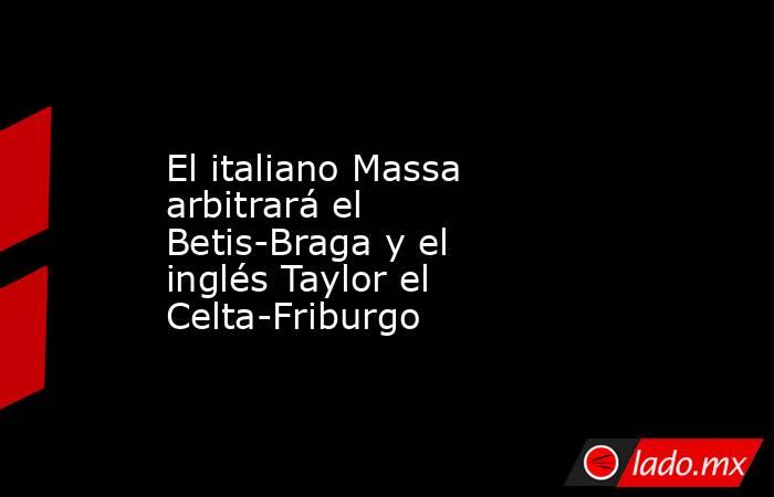 Redacción deportes, 14 abr (EFE).- El colegiado italiano Davide Massa arbitrará este jueves el partido de vuelta de los cuartos de final que enfrentará al Real Betis con el Braga en La Cartuja, mientras que el inglés Anthony Taylor pitará el duelo entre el Celta y el Friburgo que se jugará en Balaídos.
