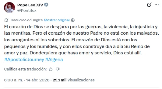 “Donde hay amor y servicio, allí está Dios. #ViajeApostólico #Argelia”.