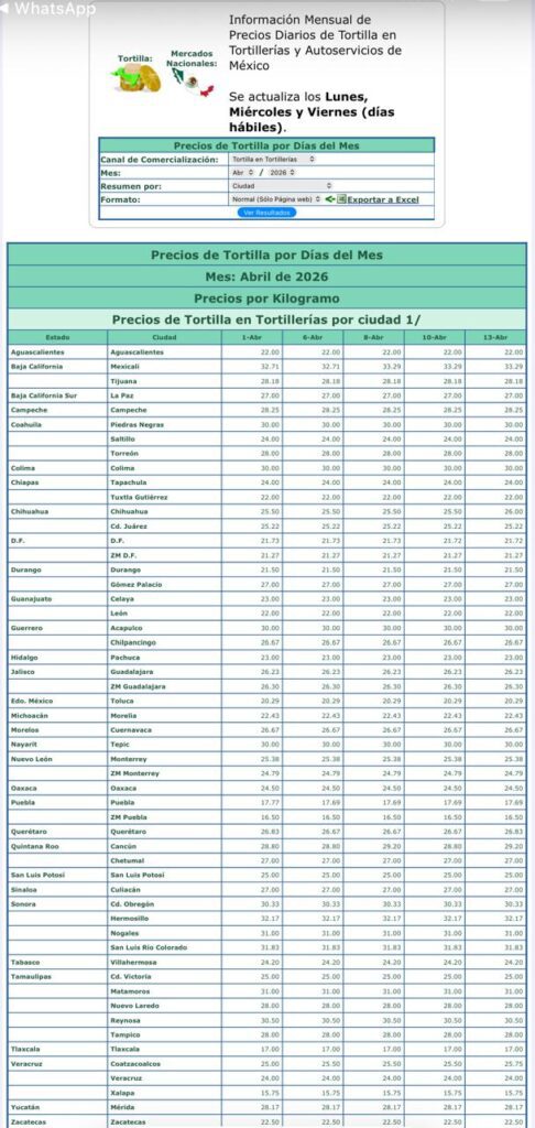 Actualmente, el kilo de tortilla presenta variaciones significativas. En zonas turísticas o fronterizas puede alcanzar hasta 32 pesos, mientras que en la Ciudad de México se mantiene en un promedio cercano a los 22 pesos.