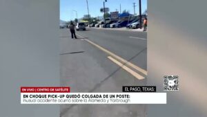 Ciudad Juarez, Chihuahua.- Un inusual accidente se registró en las calles de El Paso, Texas, específicamente sobre la Alameda y la calle Yarrock. El incidente llamó la atención de los transeúntes debido a que una camioneta pick-up negra, identificada como una unidad tipo Lobo, terminó en una posición vertical, prácticamente colgada de un poste de servicios.