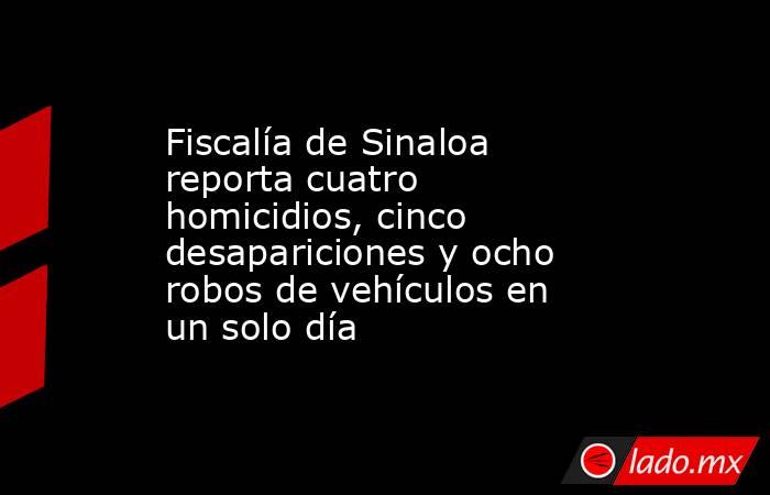 La Fiscalía General del Estado de Sinaloa informó que durante el miércoles se iniciaron cuatro carpetas de investigación por homicidio doloso, derivadas de la localización de personas sin vida en distintos puntos de la entidad, además de la apertura de expedientes por desapariciones y robos de vehículos registrados en la misma jornada.
