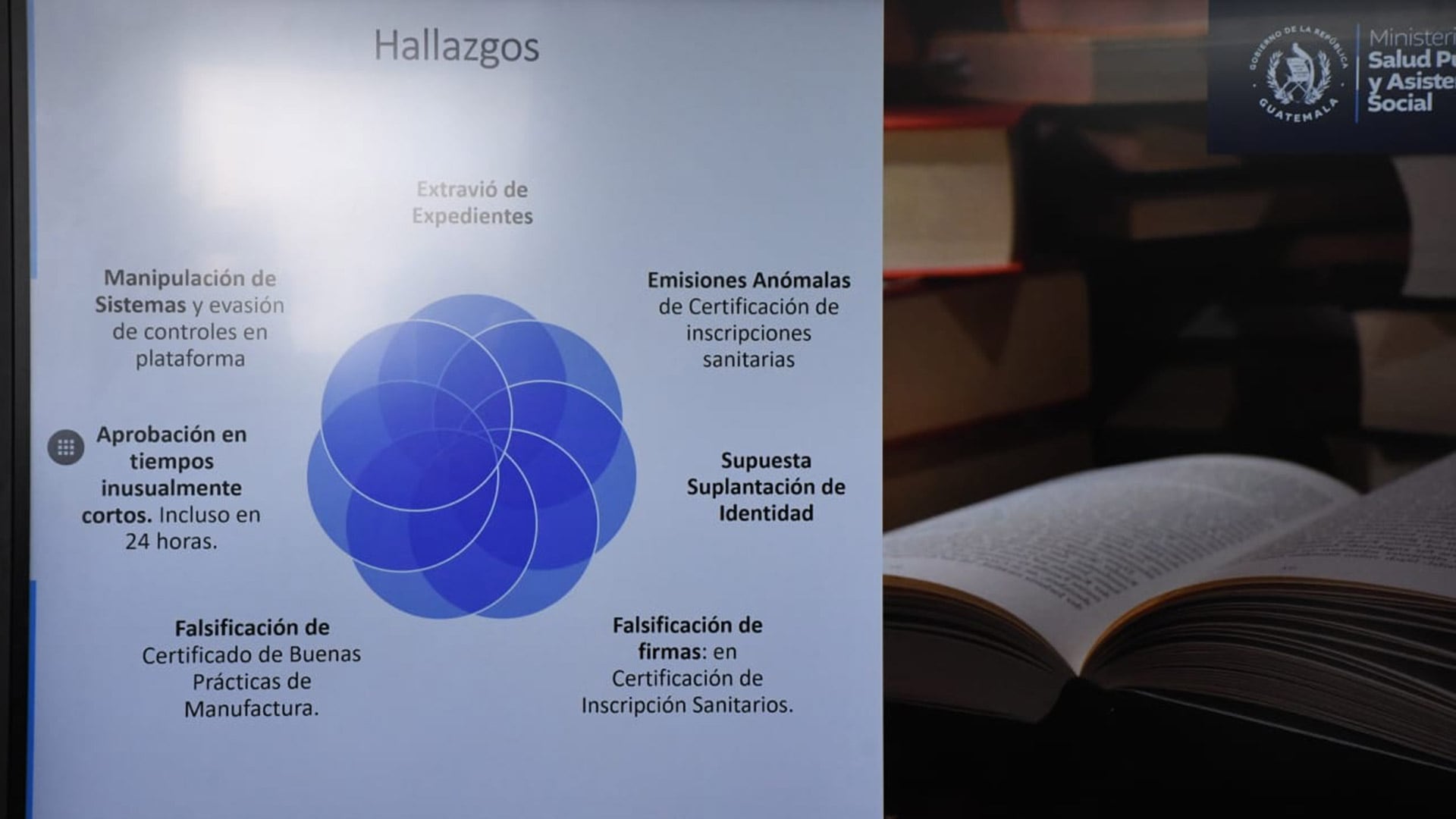 Enel cierre de 2025, la auditoría del ministerio identificó un faltante de 392certificados de buenas prácticas de manufactura. El jefe de la Unidad de Asuntos Internos, Mynor Alberto Melgar, señaló que el hallazgo implica la posible utilización de estos documentos fuera de regulación oficial. Además, el equipo consiguió establecer que al menos 189 expedientes fueron procesados sin los requisitos legales y luego desaparecieron de los archivos, y que 21 expedientes recibieron aprobación en menos de 24 horas, incluso en horarios anteriores al inicio laboral, lo que sugiere manipulaciones deliberadas del sistema.