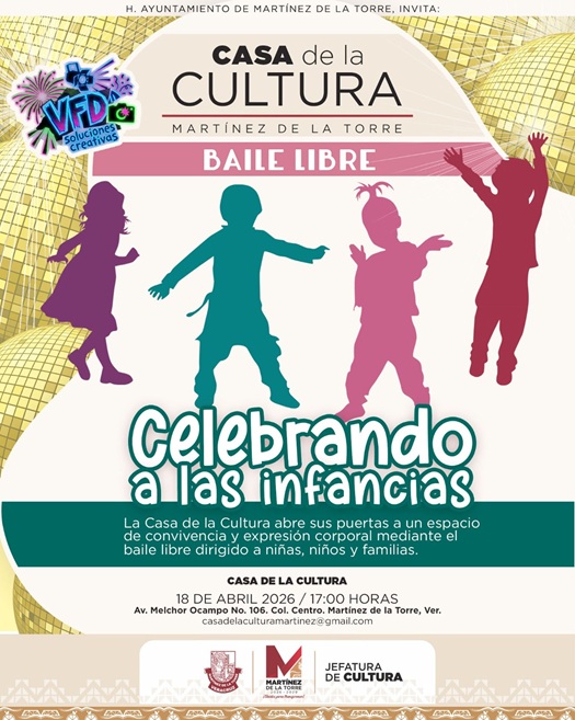 Con el objetivo de fomentar la convivencia familiar y la expresión artística, se invita a niñas, niños y sus familias a participar en el Baile Libre “Celebrando a las Infancias”, que se llevará a cabo el próximo 18 de abril a las 17:00 horas en la Casa de la Cultura.