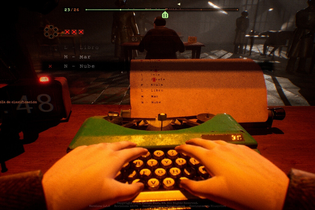 03:05 A simple vista, Final Sentence parece una idea que no debería funcionar de la forma en que lo hace, ya que su premisa es tan absurda que suena a chiste: un battle royale de mecanografía, un hangar lleno de jugadores, una máquina de escribir delante de ti y un revólver apuntando a tu cabeza.